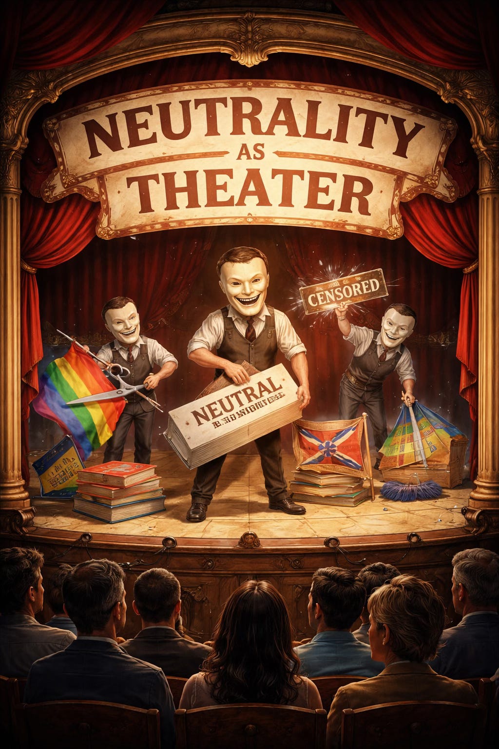 This image was generated by ChatGPT at the author’s request to visually depict the concept of “Neutrality as Theater.” The illustration portrays a theatrical stage where performers wearing exaggerated “neutral” masks engage in symbolic acts of erasure—cutting a rainbow flag, stamping materials as “censored,” and scrubbing historical references—while a diverse audience watches from below. The scene uses satire to illustrate the essay’s thesis: that so-called neutrality is not passive or objective, but an active performance that often conceals selective exclusion.